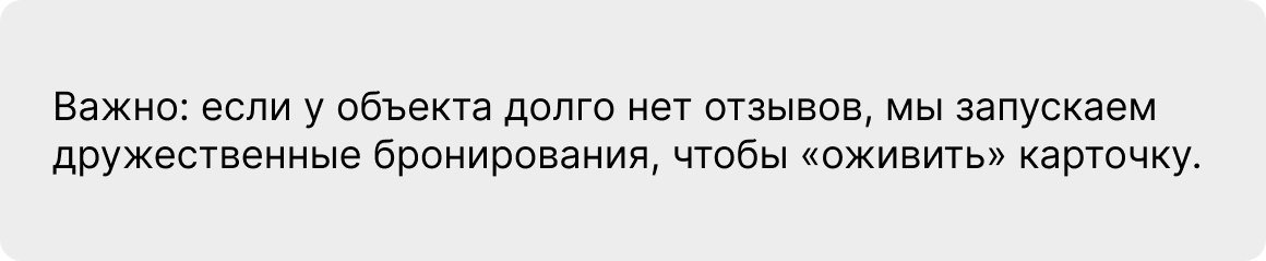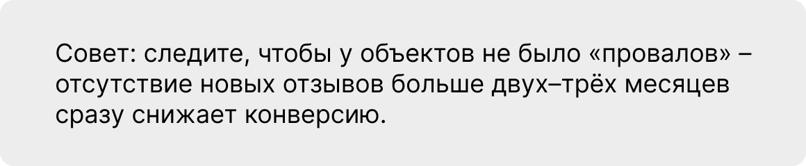 Отзывы напрямую влияют на рейтинг объекта, а рейтинг – на позицию объявления на площадке. Чем выше доверие гостей, тем выше конверсия бронирований.