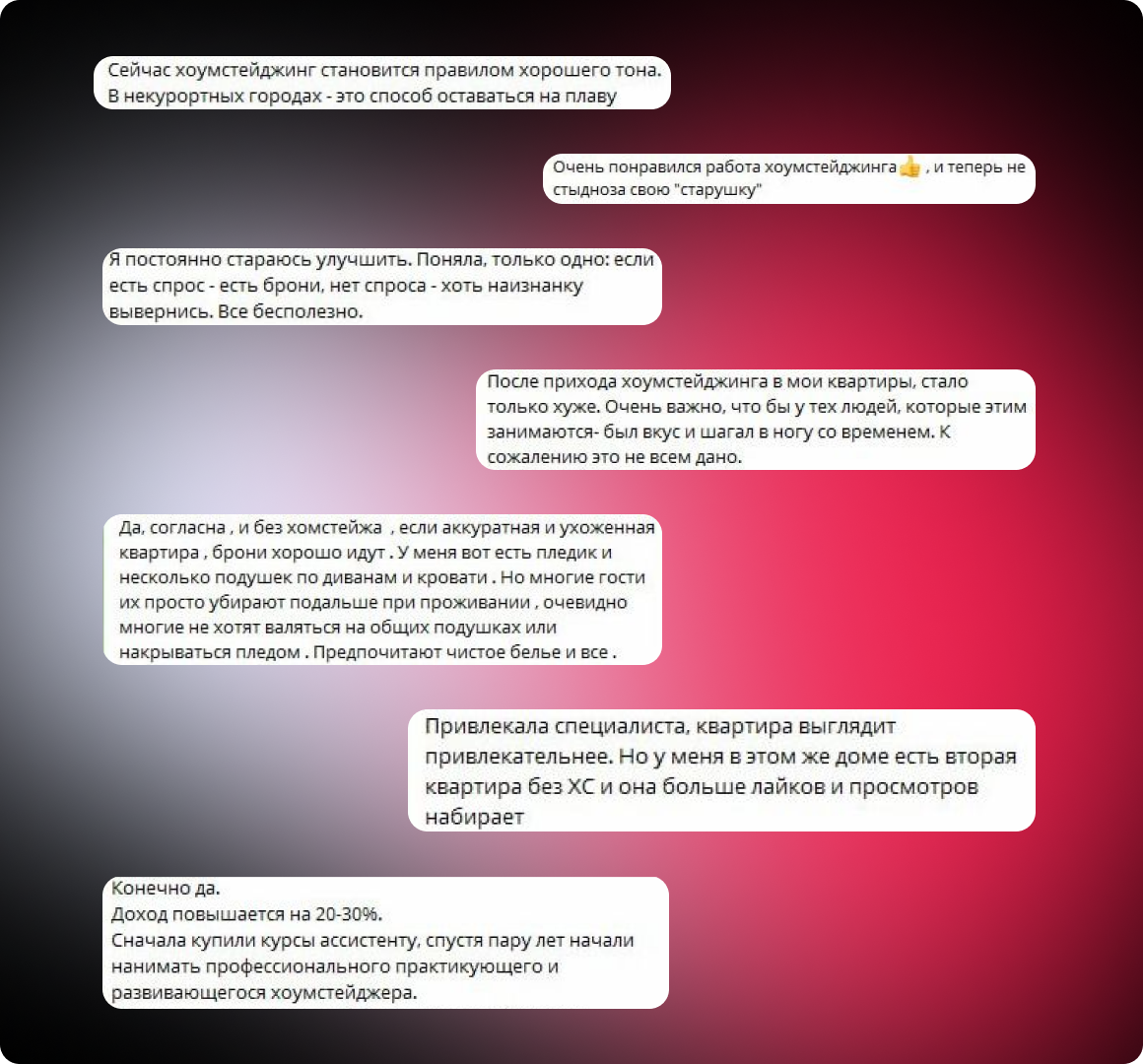 Мнения владельцев объектов на эту тему разделились. Одни считают, что хоумстейджинг необходим, ведь с его помощью можно не только увеличить доход со сдачи квартир, но и в целом улучшить её привлекательность на рынке. Другие – что для роста числа броней достаточно следить за тем, чтобы объект был чистым и ухоженным. Нашлись и те, кто отнёсся к хоумстейджингу скептически.