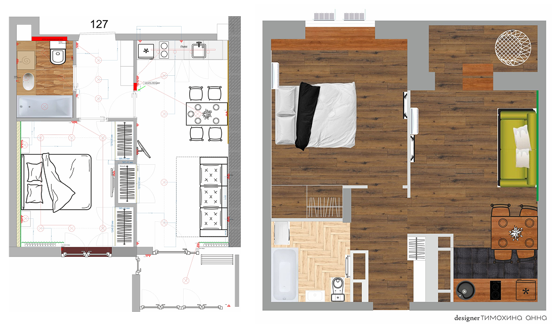 – Да, я сама его рисовала в графическом редакторе. Не в профессиональной программе, а там, где умею. Готовила чертежи, с мужем мы продумывали разводку электрики, где будут розетки, как провести канализацию, в какую сторону будут открываться двери. Всё это прорисовали, а потом наняли бригаду, и они выполнили черновую работу. После них мы красили стены, клеили кирпичики.