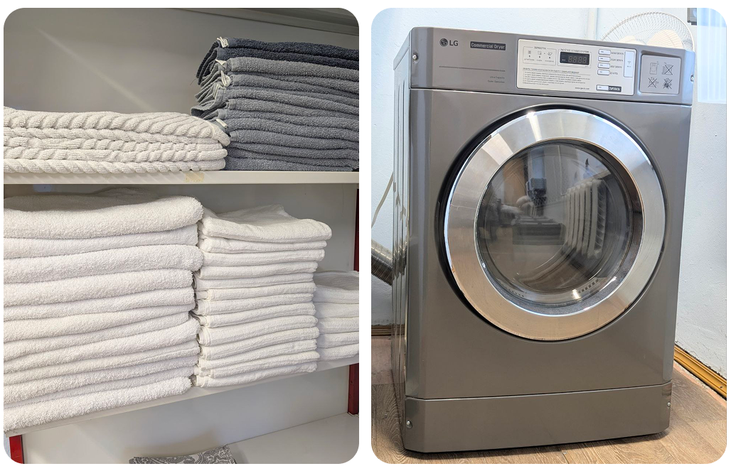 Первым шагом стала покупка бытовой сушильной машины. В течение двух лет, пока у нас была пара объектов, мы справлялись благодаря ей и стиральной машине. Сейчас с ужасом вспоминаю горы белья, которые скапливались дома, и утюг с гладильной доской, которые ждали меня вечерами после основной работы. Загрузка не в сезон была терпимой, а вот летом создавалось ощущение, что мы круглые сутки дежурим у техники.