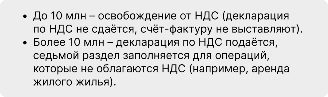 Важно: перечень освобождённых операций большой (аренда жилья, продажа жилья, медицинские товары, турпродукт прочие), но для каждого пункта есть дополнительные условия.