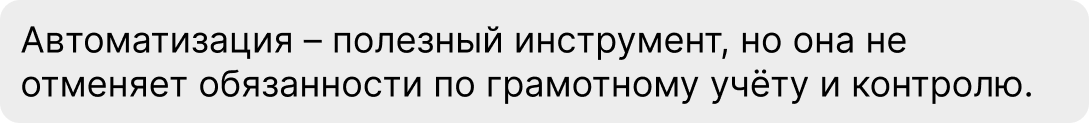 Важно: даже при автоматизации учётных операций через банк или платформу бухгалтер нужен. Автоматические системы могут неправильно классифицировать возвраты, агентские поступления, корректировки и прочее, а ошибки в классификации влияют на размер налога. Бухгалтер: