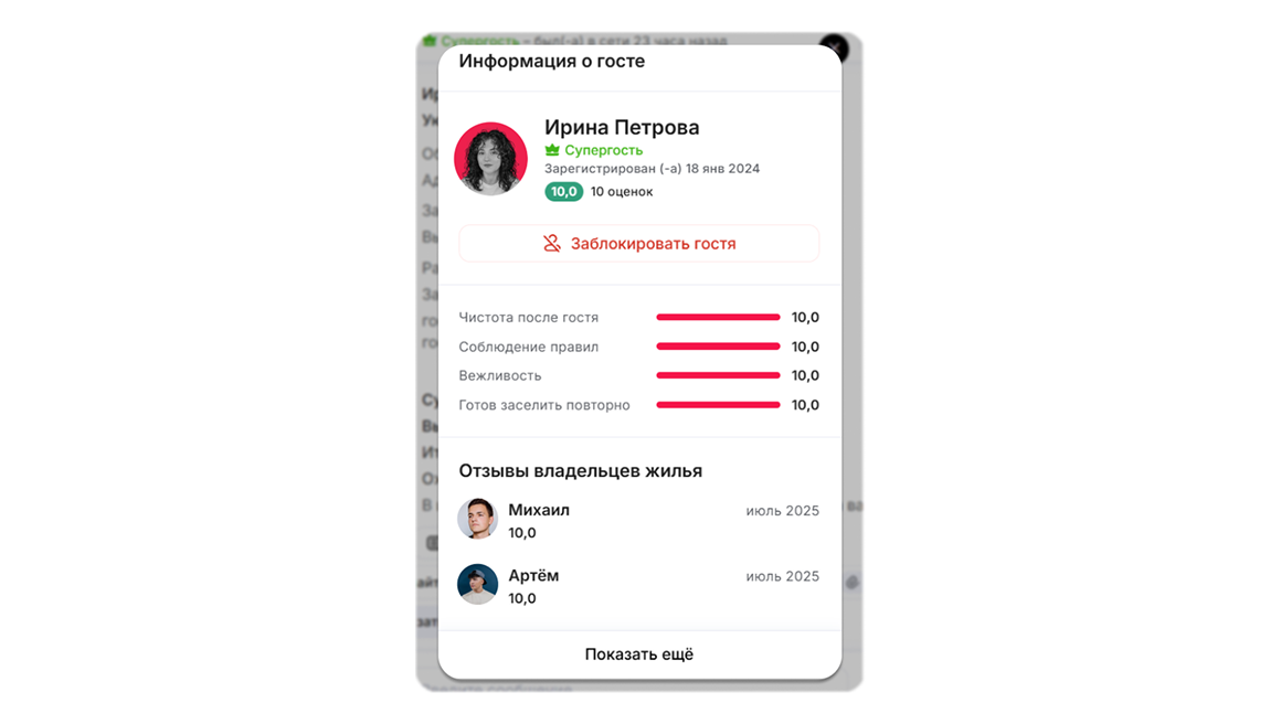 Не забывайте ставить им оценки – Супергости получают свой статус именно благодаря им. Чем активнее вы (и другие владельцы объектов размещения) оцениваете гостей, тем больше информации о них будет у вас при заселении.