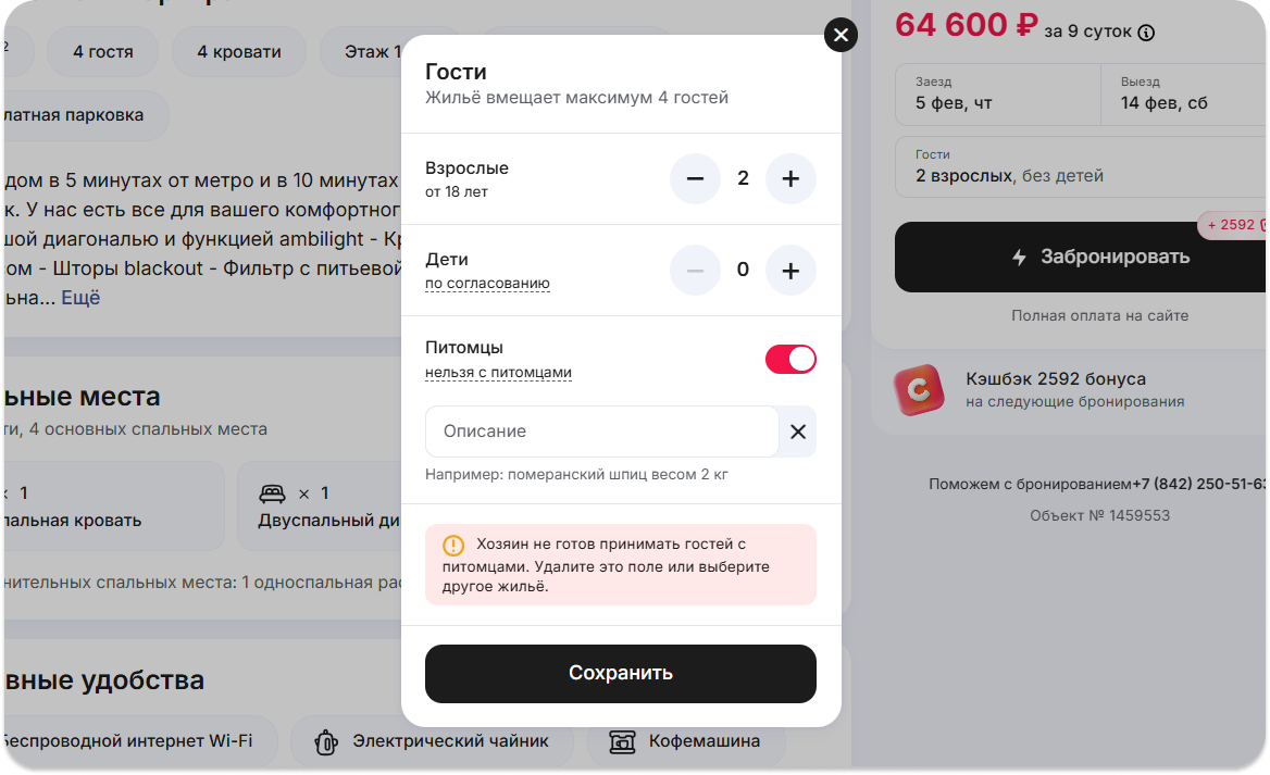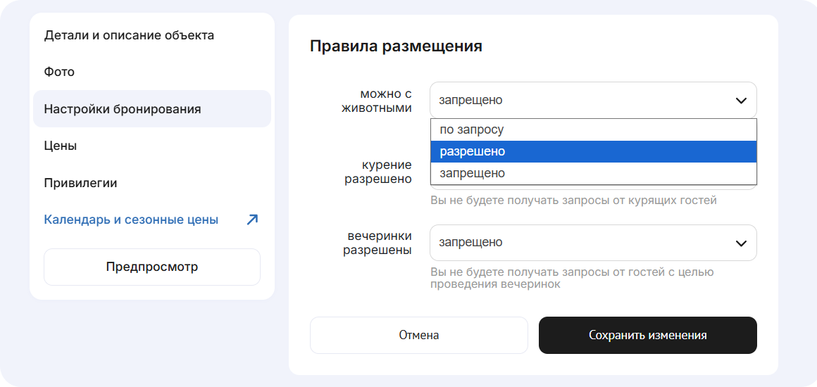 Настройка правил размещения с животными – это простой способ управлять заявками и устанавливать чёткие условия. Вы можете гибко подходить к каждому случаю: разрешать проживание автоматически или в ручном режиме с возможностью установить дополнительную плату, а также полностью исключить такие запросы.