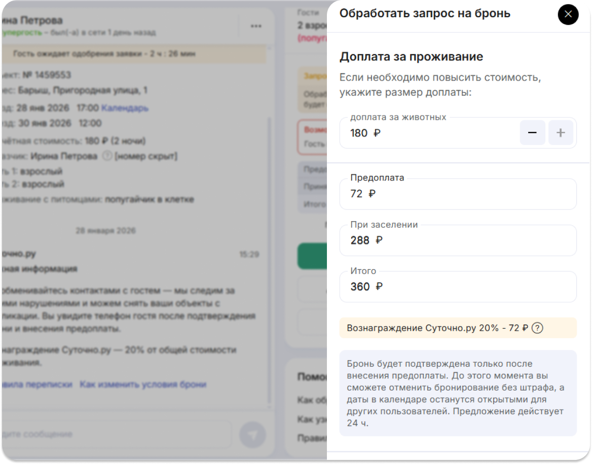 У вас, как хозяина, будет возможность её подтвердить или отклонить. В первом случае система предложит установить доплату за проживание с животными: максимум – общая стоимость брони. Например, если у вас хотят забронировать жильё на двое суток, максимальная доплата будет равна стоимости за них.