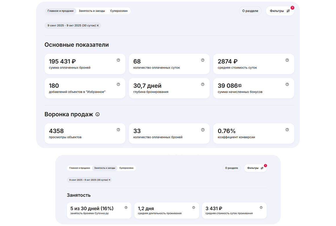 В том же разделе «Статистика» в блоке «Воронка продаж» вы увидите количество просмотров объекта и сколько бронирований вы из них получили. А коэффициент конверсии рассчитается автоматически. Если вы внесли какие-либо изменения – например, обновили описание объекта или поменяли фотографии – это показатель покажет вам их эффективность.