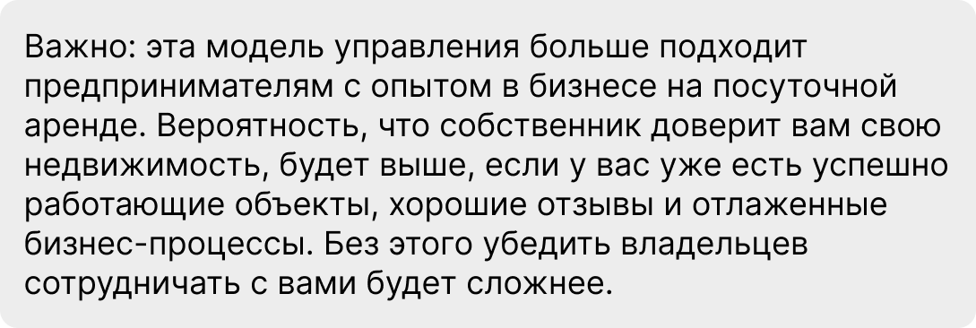 Начните с субаренды, чтобы набраться опыта, а затем, по мере роста, добавляйте объекты в управление для быстрого захвата рынка.