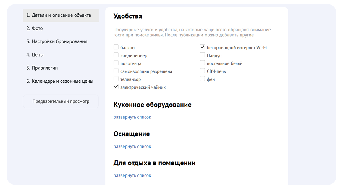 В настройках объявления заполните раздел «Удобства» и проставьте галочки. Это нужно для того, чтобы гости заметили ваши квартиры, апартаменты, гостевые дома, номера в одном из множества фильтров в поиске.
