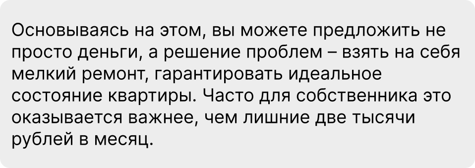 Пример: вы хотите взять квартиру в субаренду, но собственник просит слишком высокую цену. Вместо того чтобы просто торговаться, попробуйте понять его страхи: «боюсь, что квартиру "убьют"», «не хочу заниматься мелким ремонтом».