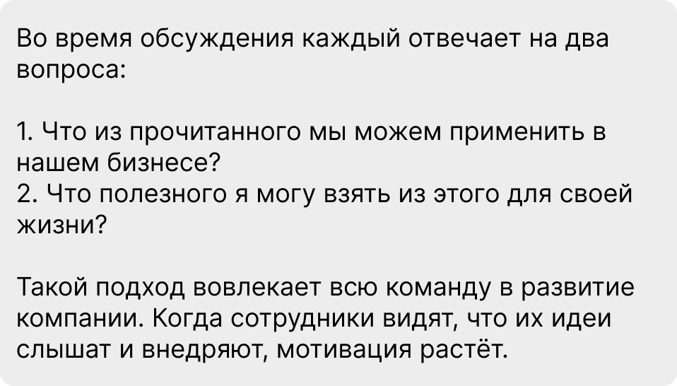 Прежде чем перейти к списку, поделюсь главным принципом. Просто прочитать книгу – лишь половина дела, потому что знания, которые не применяются на практике, мертвы. Поэтому мы в компании придумали свой формат – нечто вроде читательского клуба.