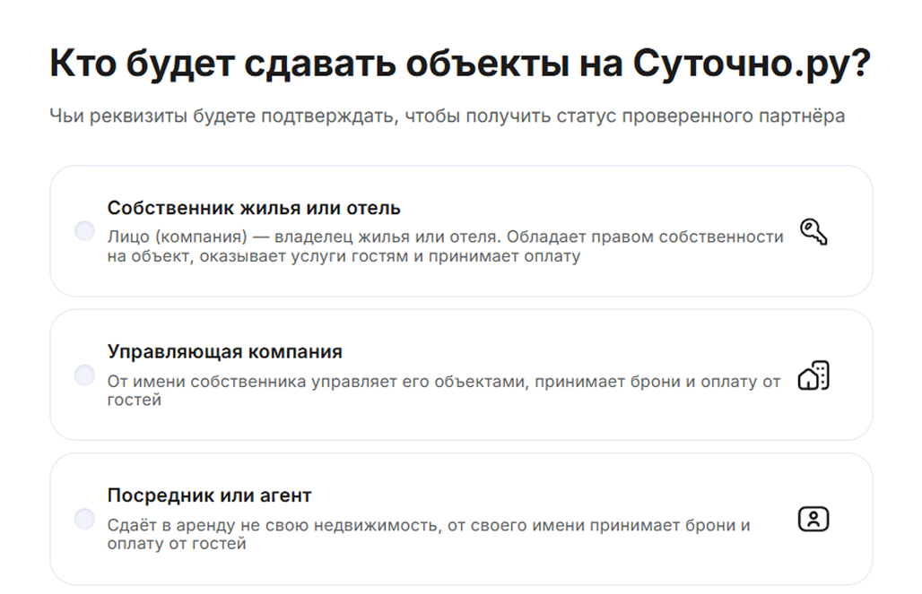 2. Выберите, от чьего имени сдаётся жильё (собственник/УК/посредник) и страну регистрации.