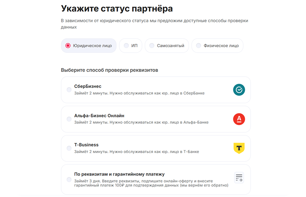 3. Укажите статус партнёра (юрлицо, ИП, самозанятый, физлицо) и выберите один из трёх банков: Сбер, Т-Банк или Альфа.