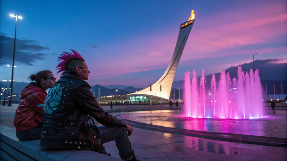 Вечером туристов привлекает поющий фонтан со светомузыкальным шоу. Найти его легко: это высокая чаша, в которой в 2014 году горел олимпийский огонь.