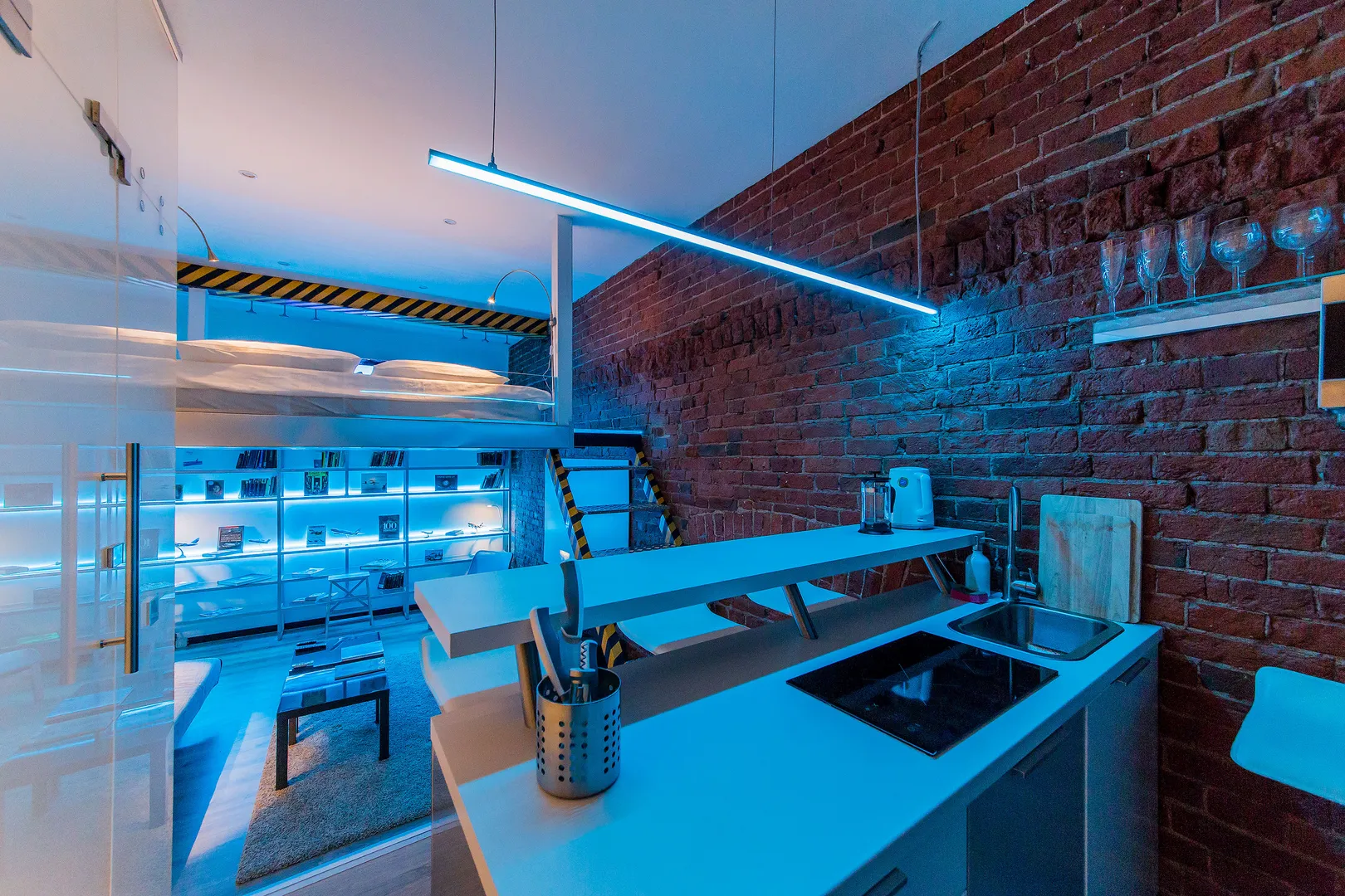 В нашей студии площадью в 37 кв.м. Вы найдете: 4 комфортных спальных мест, душ, фен, барную стойку, холодильник и микроволновку, утюг и гладильную доску, домашний кинотеатр, стереосистему, Apple TV, 110-тв.каналов на проекции диагональю 3,5 метра, мини-библиотеку - от комиксов Эрже до поучений аввы Дорофея (а так же огромные альбомы по фото и живописи), бесплатный 30-мегабитный wi-fi и все это в непосредственной близости от Чистых прудов, Кремля и, разумеется, бесконечного количества уютных кафе и баров.