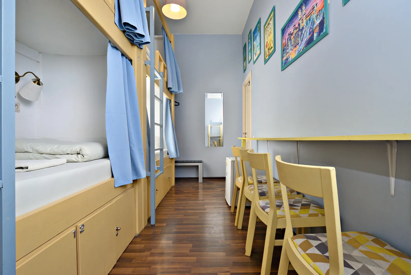 Для вас в номере персональная розетка, персональные бра, шторка на каждой кровати, постельное белье, полотенце, общий стол и стулья в номере, этажерка, вешалка, индивидуальные шкафчики с замком, зеркало.