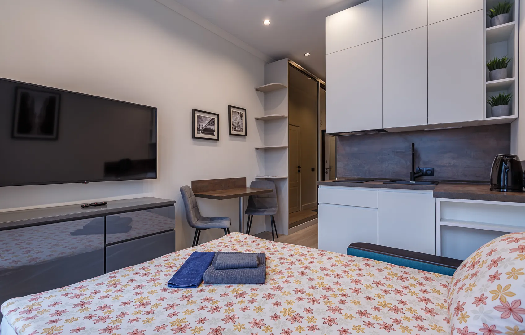 Отличное месторасположение, рядом метро, магазины, кафе. Чисто, уютно. Впечатления очень положительные.