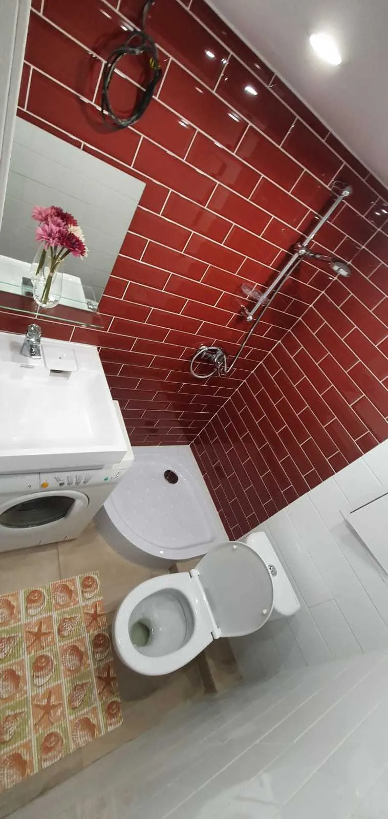 На фото не было видно дыры в натяжном потолке, которая постепенно расходится. Довольно сомнительный душ, он открытый, есть шторка, которая не доходит до пола, поэтому вся вода выливается на пол и очень долго уходит, в основном ходишь по огромной луже, внизу уже разбухло дерево. Плюс очень душно сверху, хоть и есть вентиляция, но она будто бы не работает, приходится спать с настежь открытым окном, из-за чего внизу очень холодно. Техника (холодильник, стиральная машина) очень старые. Слышимость огромная, когда лежишь на втором этаже и кто-то из соседей открывает дверь - ощущение, будто открывают твою, не совсем безопасно. На втором этаже человеку ростом 175+ не посидеть, только лежать