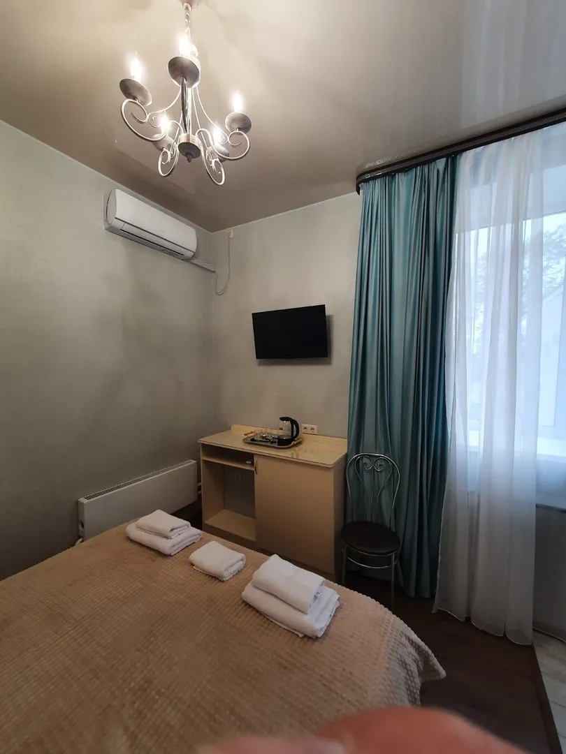 Уютный номер с самым необходимым для двух человек. Продуманный оригинальный интерьер с современной мебелью и двухспальной кроватью.