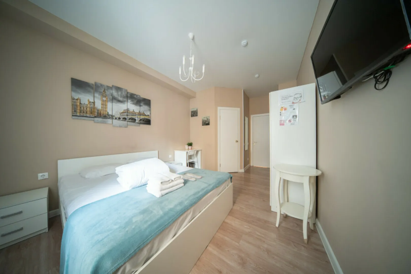 Отличные апартаменты за свои деньги, удобное заселение. Номер небольшой, но все как на фото. В общей зоне есть чайник, микроволновка, утюг.