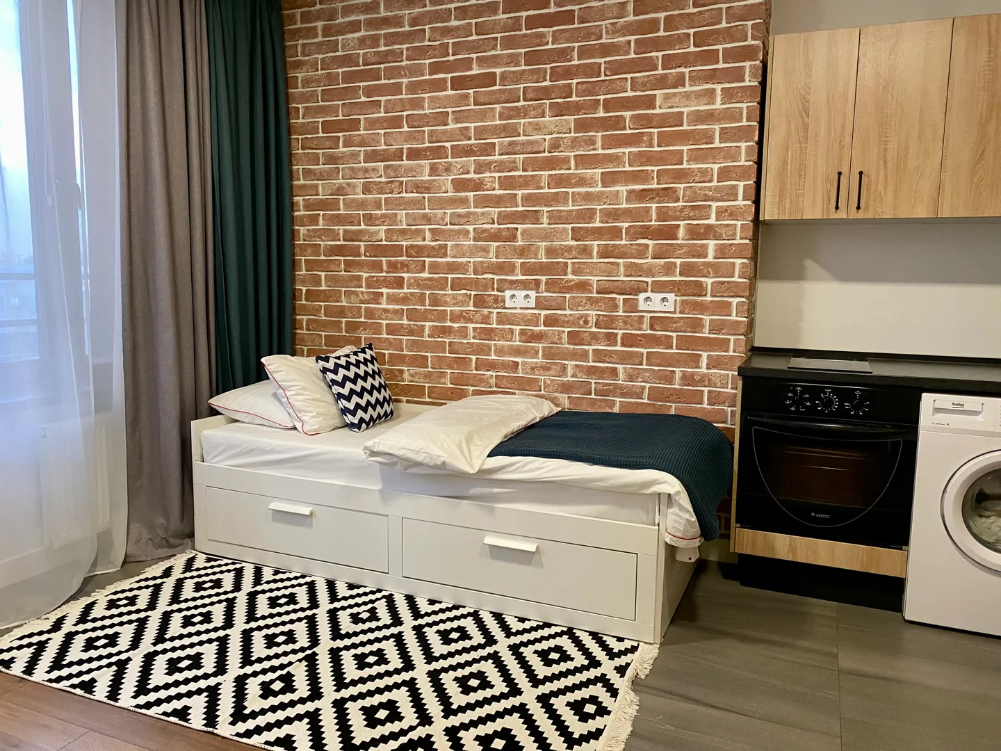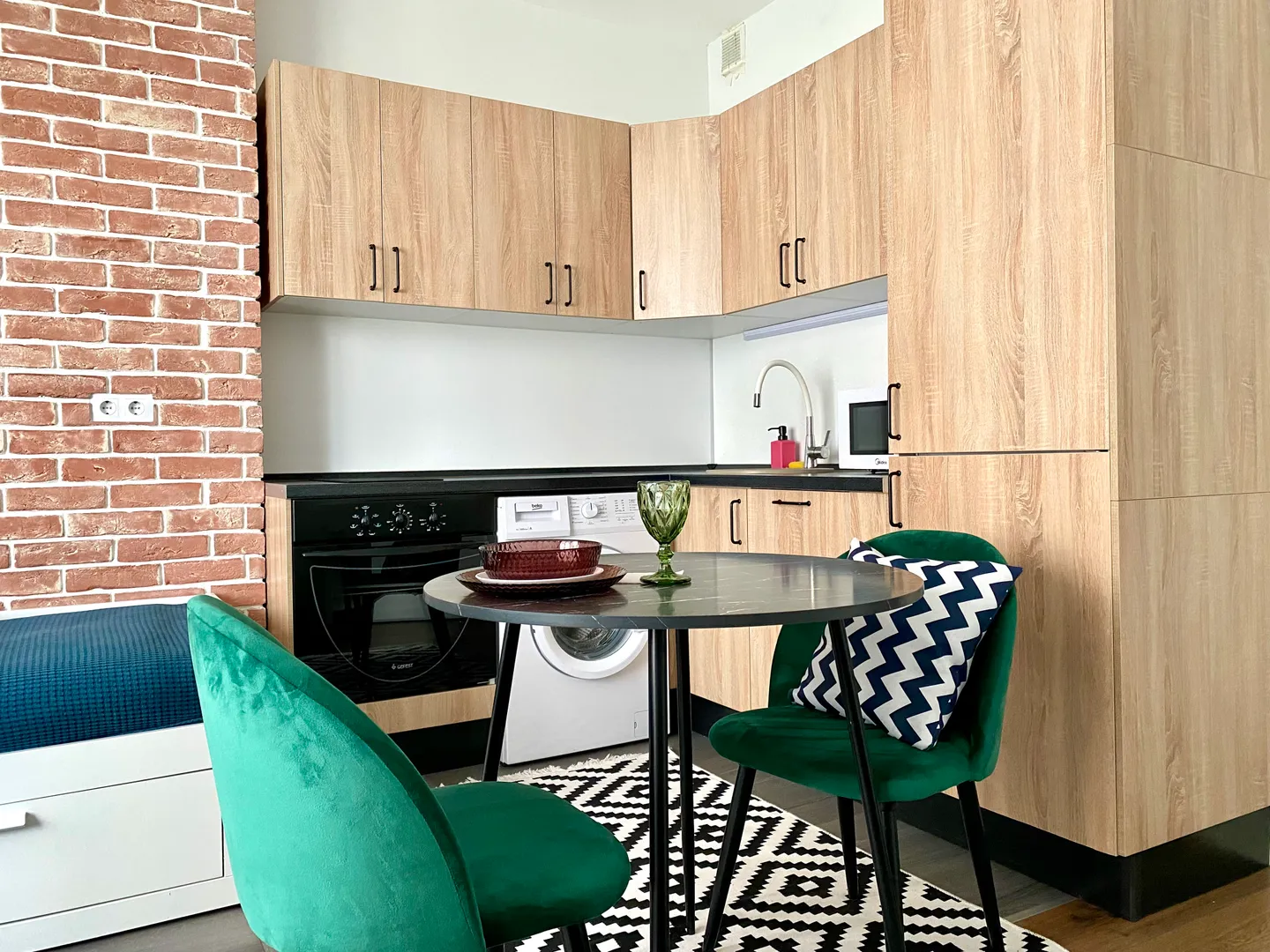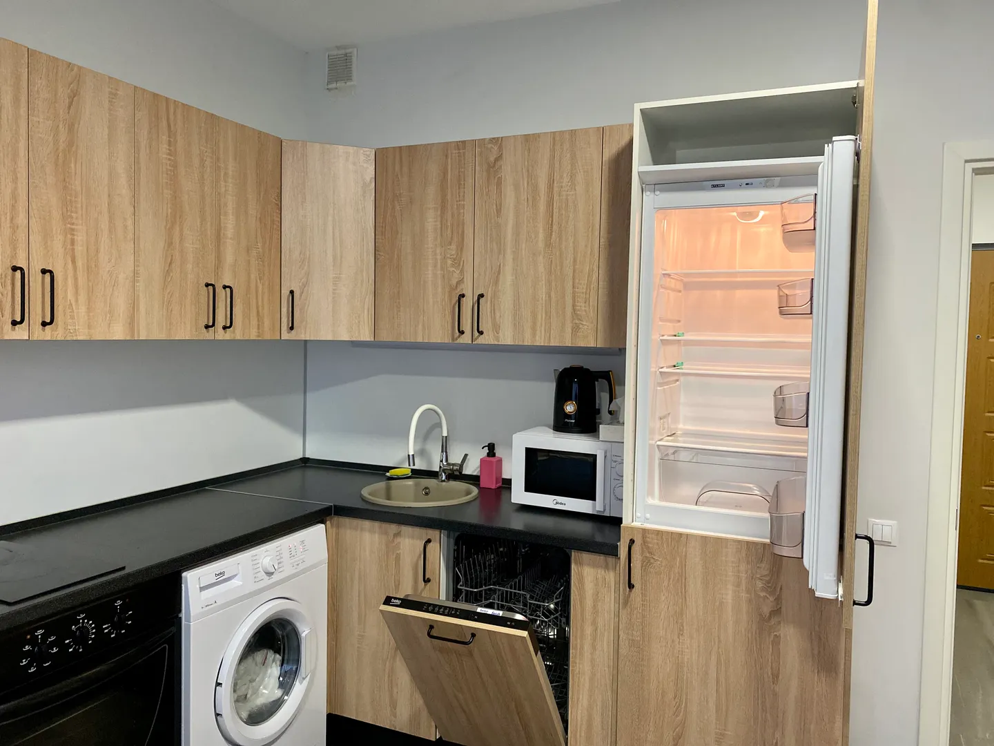 Достаточно просторные апартаменты. Есть все необходимое. Большой холодильник. На кухне есть базовые вещи: масло, соль, сахар, чай, приправы. Хороший диван, на котором спал. Возможно полноценное размещение до 3-х человек.