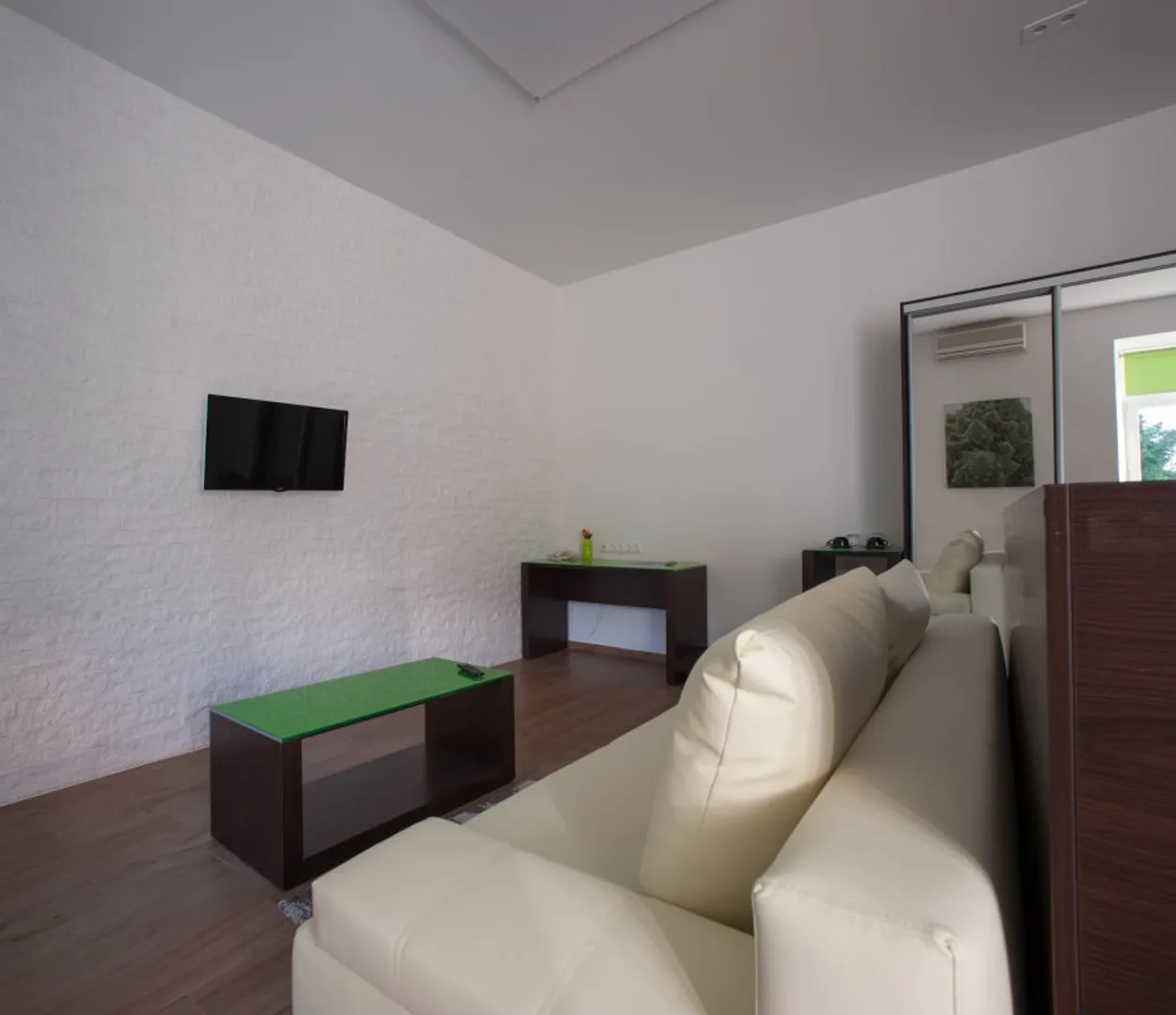 Двуспальная кровать, телефон, кондиционер, wi-fi, электронные замки, багажная тумба, вешалки, зеркало, письменный стол, стулья, обслуживание номеров, письменные принадлежности, плиточное покрытие, телевизор с плоским экраном, стол, шкаф-купе, раскладной диван, чайная станция, чай, кофе, питьевая бутилированная вода; много места и воздуха.