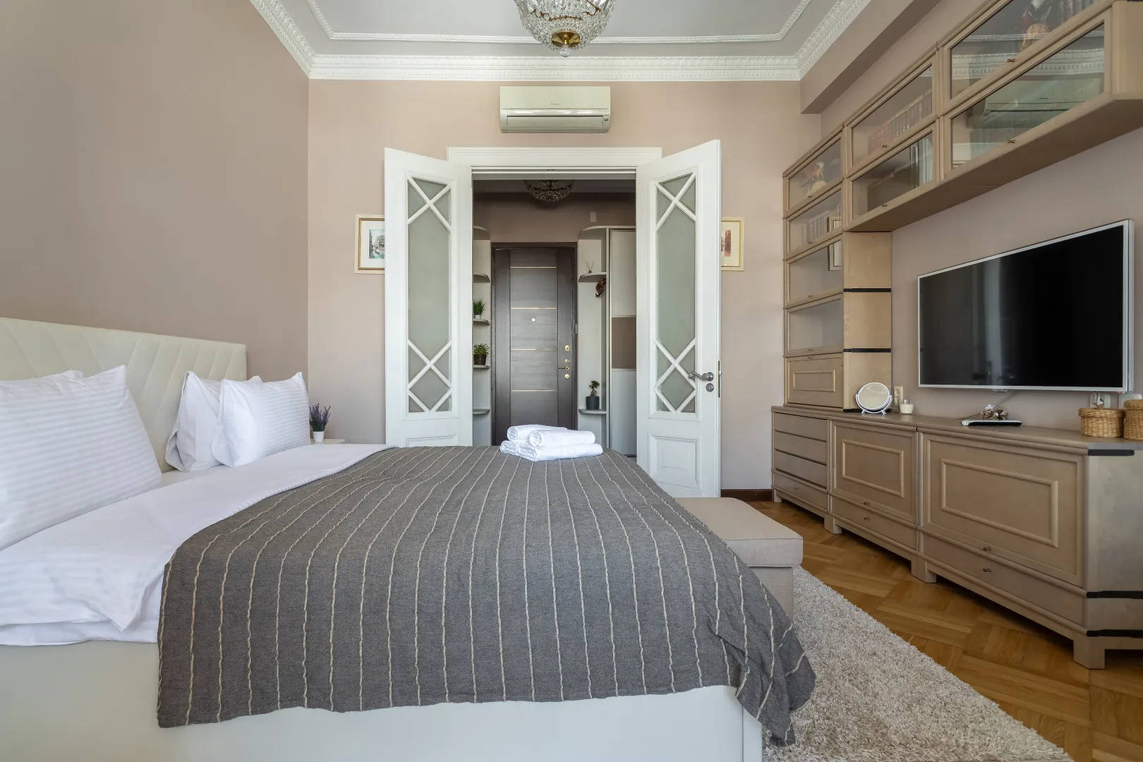Современные двухкомнатные апартаменты с видом на город, кондиционер, ортопедический матрас, высокоскоростной wi-fi, отчетные документы, высокие рейтинги.