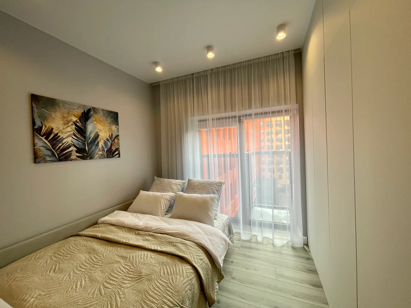 В апартаментах для максимального комфорта - имеются затемняющие шторы блэкаут и зондирующая перегородка отделяющая спальню от кухни.