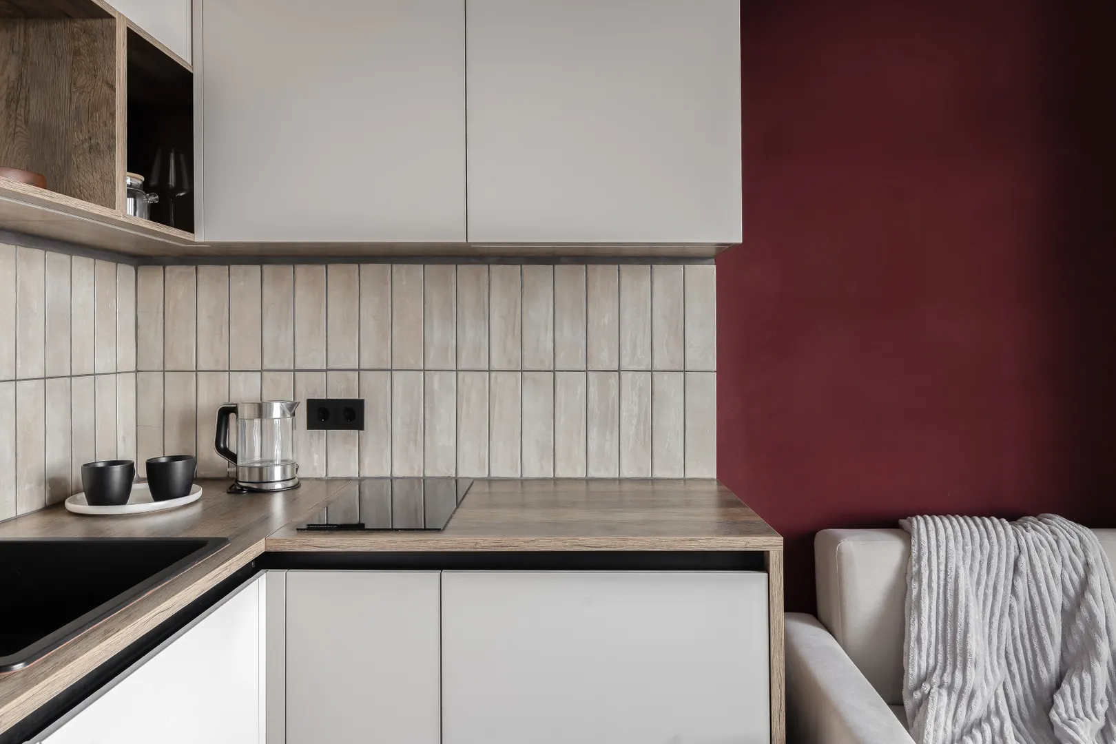 Кухня оборудована всем необходимым для приготовления блюд: холодильник, посудомойка, индукционная плита, чайник, микроволновая печь, набор посуды: тарелки, приборы, стаканы, бокалы. Для приготовления пищи есть сковородка, кастрюли.