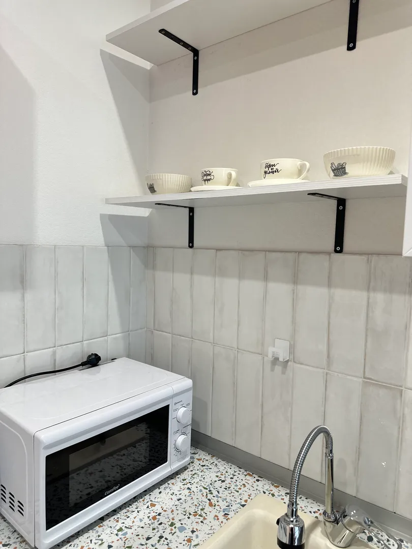 Прекрасная уютная студия, в которой есть всё необходимое для жизни! В шаговой доступности остановка трамвая, который едет до метро. В самом доме супермаркет, пекарня, магазины, аптека.
