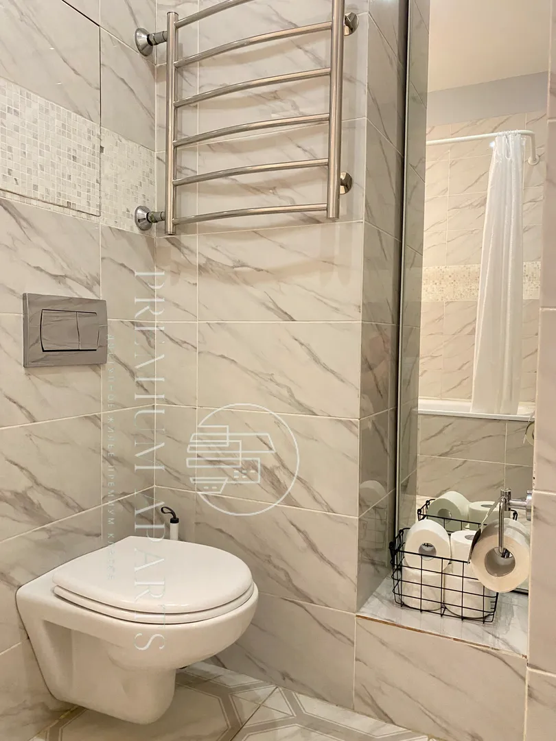 В гардеробе просторный встроенный шкаф, а большое зеркало поможет вам всегда выглядеть как с иголочки.