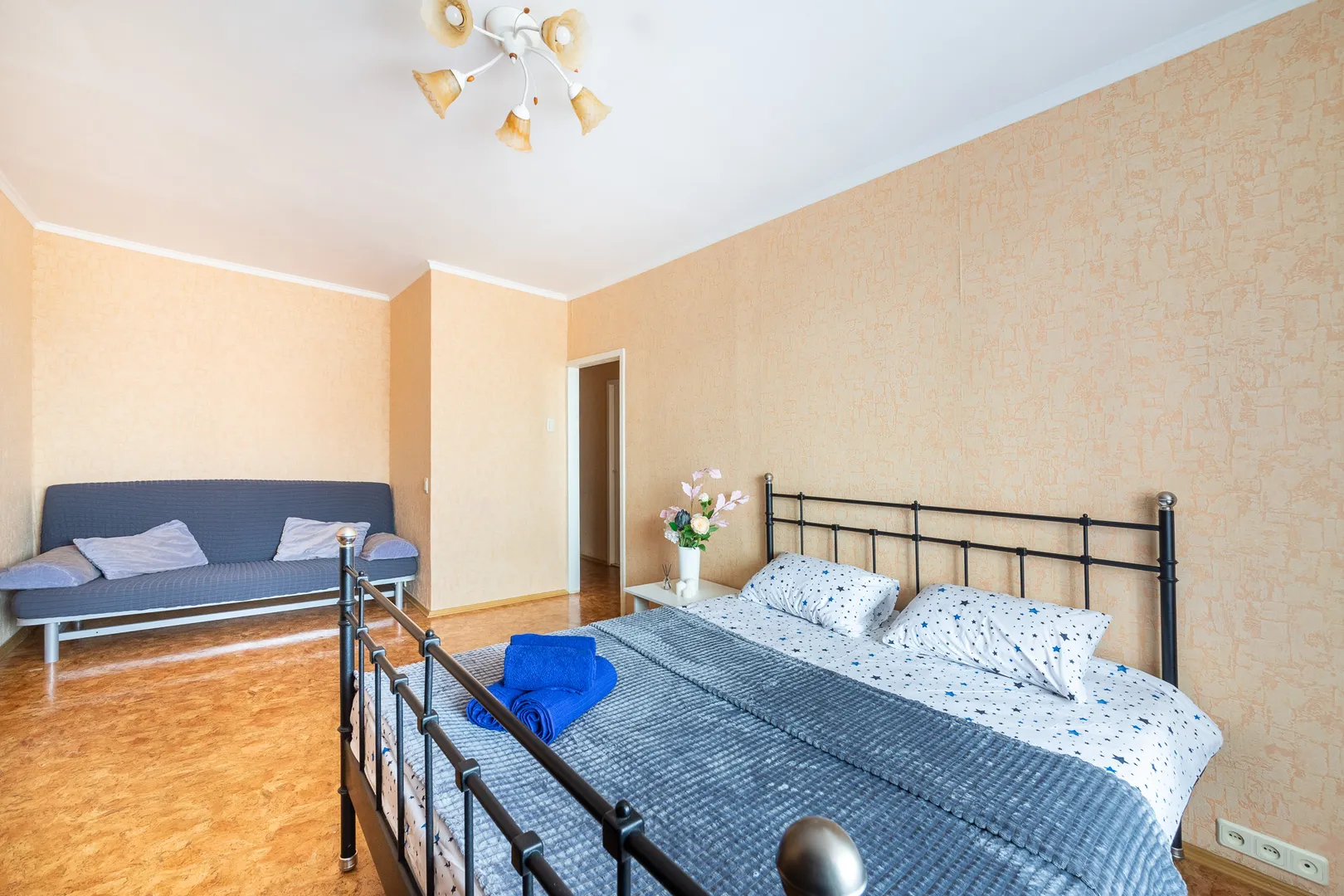 В спальне — двуспальная кровать, вместительный шкаф, телевизор и комод. Также есть раскладной диван-кровать как дополнительное спальное место.
