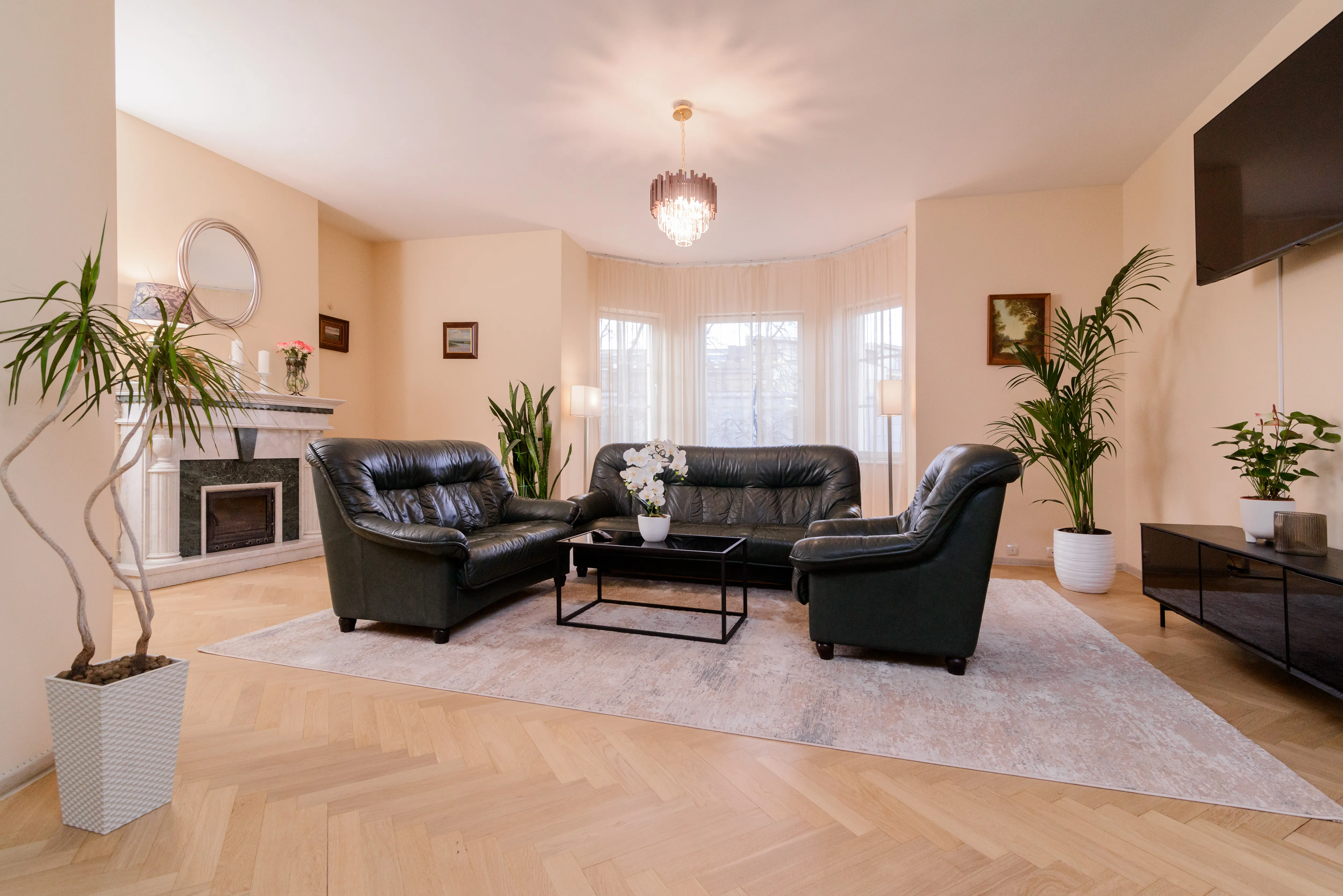 Элитная пятикомнатная квартира площадью 216 квадратных метров на четвёртом этаже кирпичного дома в самом сердце столицы. В нескольких минутах пешего шага от метро Третьяковская, Новокузнецкая, Полянка, и в 5-ти (! ) минутах пешком от Красной площади. Четыре спальные комнаты, гостиная с кухней-столовой и раздельные полноценные ванная комната и туалет. Все комнаты и кухня-столовая просторные, полностью изолированные и обставлены дорогой дизайнерской мебелью. Две главные мастер-спальни оборудованы огромными (200×180) кроватями, зеркалами, комодами и шкафами-купе. В одной мастер-спальне также имеется дополнительный раскладывающийся двуспальный диван. В третьей спальне имеется кровать, зеркало и шкаф-купе. Четвертая спальная комната выполнена в восточном стиле и содержит раскладной двуспальный диван, полки для хранения и изысканный восточный стол. В просторной гостиной находится раскладной двуспальный диван и кресла, в которых так приятно проводить время у камина или у огромного телевизора. В квартире есть два балкона с красивыми видами на живописные московские крыши, на которых комфортно отдыхать летом с чашечкой кофе за столиком на удобном стуле. Кухня-столовая оборудована кухонной зоной, содержащей все необходимое кухонное оборудование — плиту, духовой шкаф, микроволновую печь, посудомоечную машину, холодильник, чайник и все необходимое для готовки. Также в столовой имеются большой обеденный стол. Окна квартиры выходят во двор и на небольшую улочку, поэтому в комнатах очень тихо. В квартире высокие потолки, что дает ощущение свободы и пространства. Прекрасный ремонт, дорогая мебель и сдержанный стиль в оформлении интерьера создают ощущение роскоши и комфорта, а также уютное и радостное настроение.