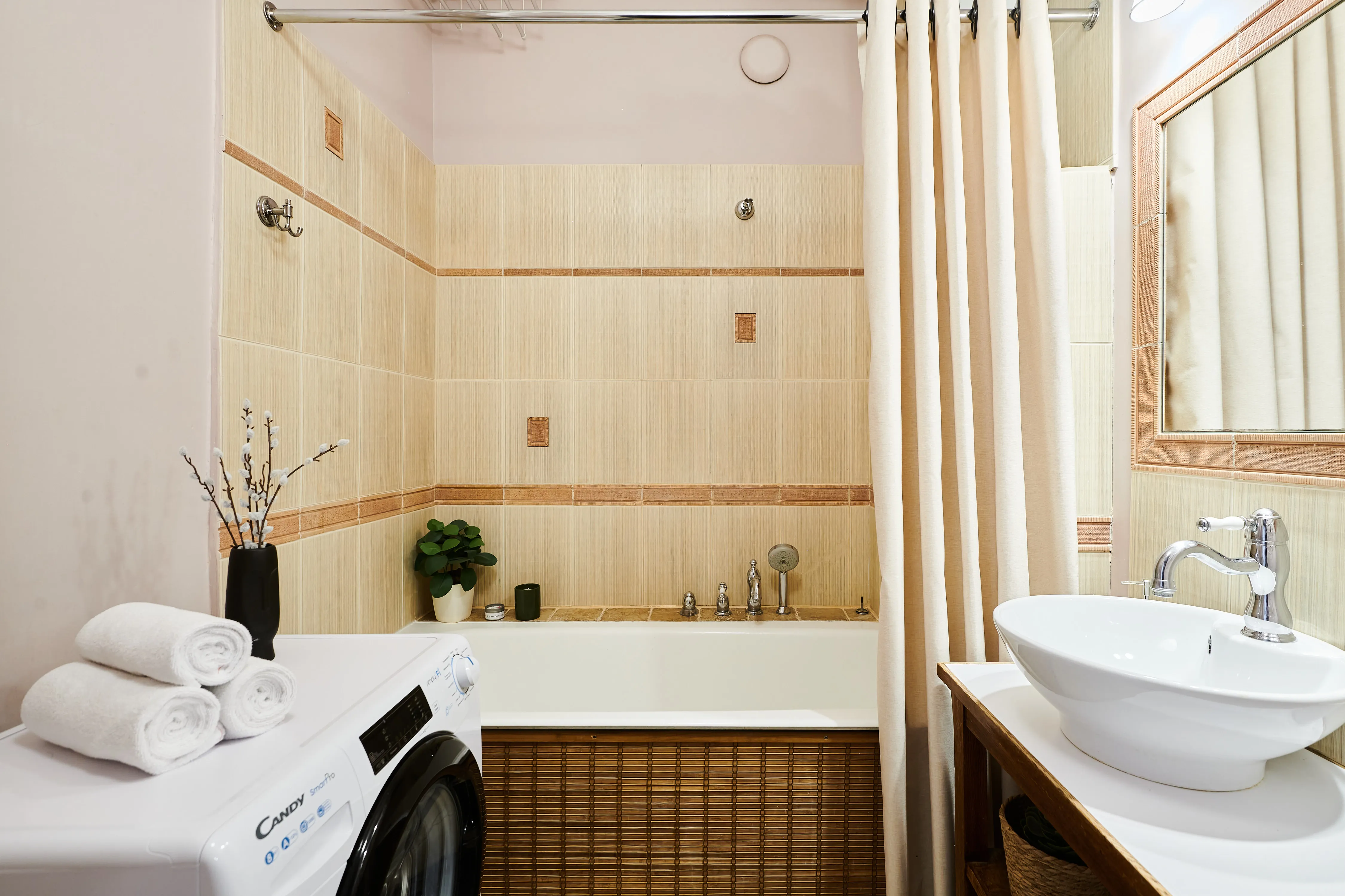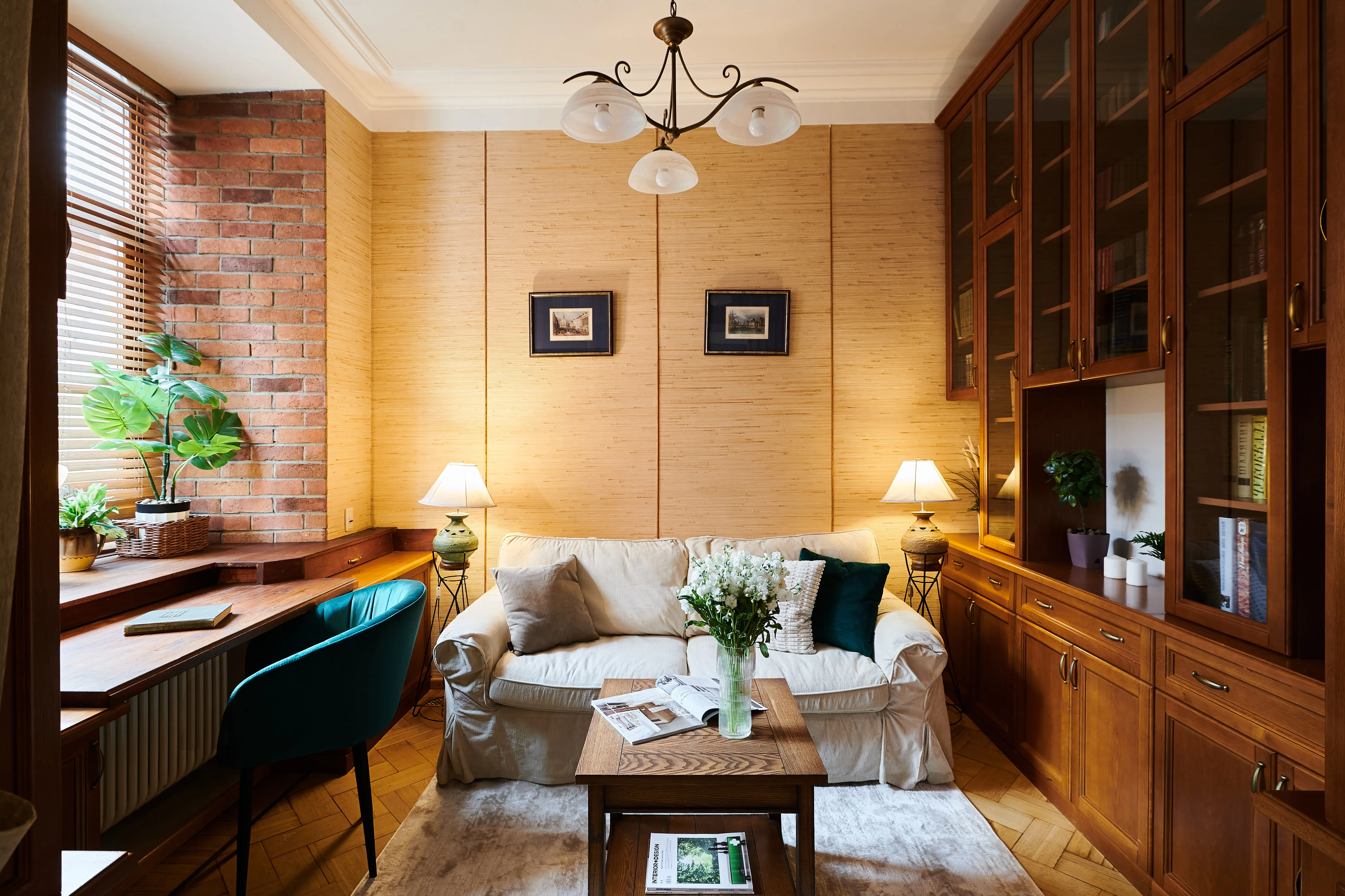 Интерьер квартиры отличается особой теплотой и уютом благодаря аутентичным предметам, создающим уникальный стиль помещения. Просторная гостиная становится идеальным местом для проведения времени с семьей или друзьями.