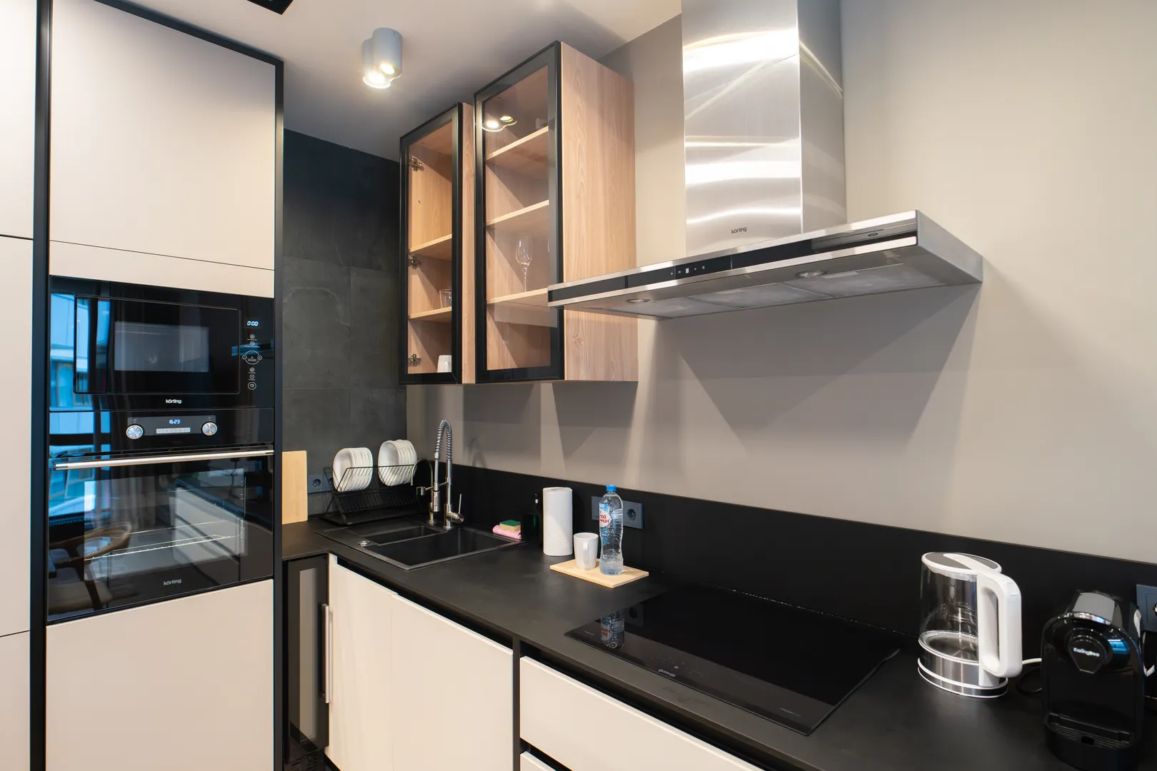- Современная кухня в полной комплектации словно приглашает к уютным завтракам или вечерним разговорам за бокалом вина. Мини-бар позволит вкусно перекусить в перерыве между делами.