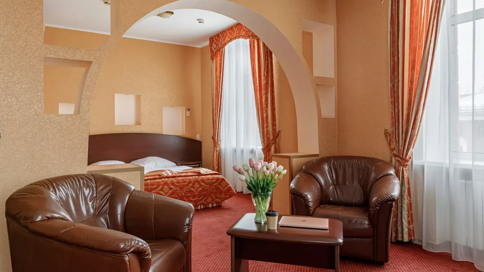 В номере категории “Полулюкс” предусмотрено рабочее место: письменный стол со стулом. Также в номере есть место для отдыха: два уютных кожаных кресла и журнальный столик, телевизор, музыкальный центр, мини-холодильник, кондиционер, телефон, бесплатный интернет Wi-Fi.