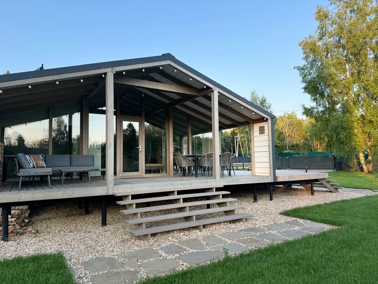 - Крытая веранда с обеденной и диванной зоной;