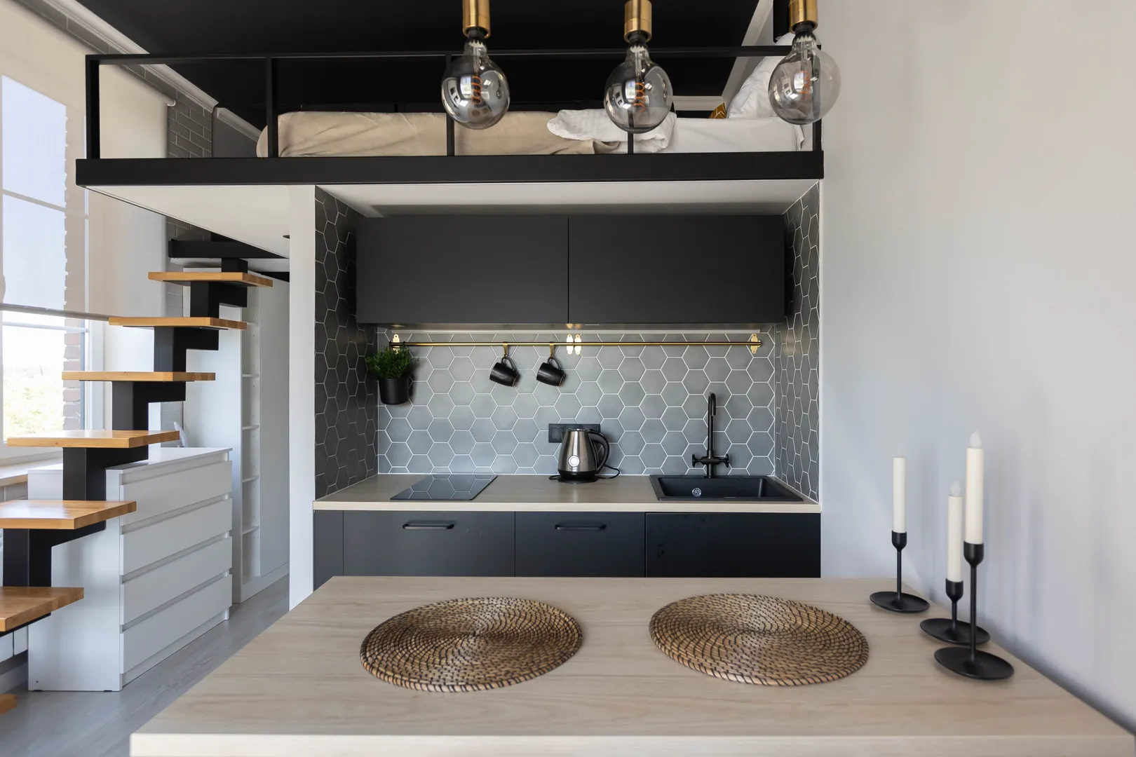 Студия двухуровневая для 4-х гостей. На втором этаже расположена кровать. На первом этаже диван.