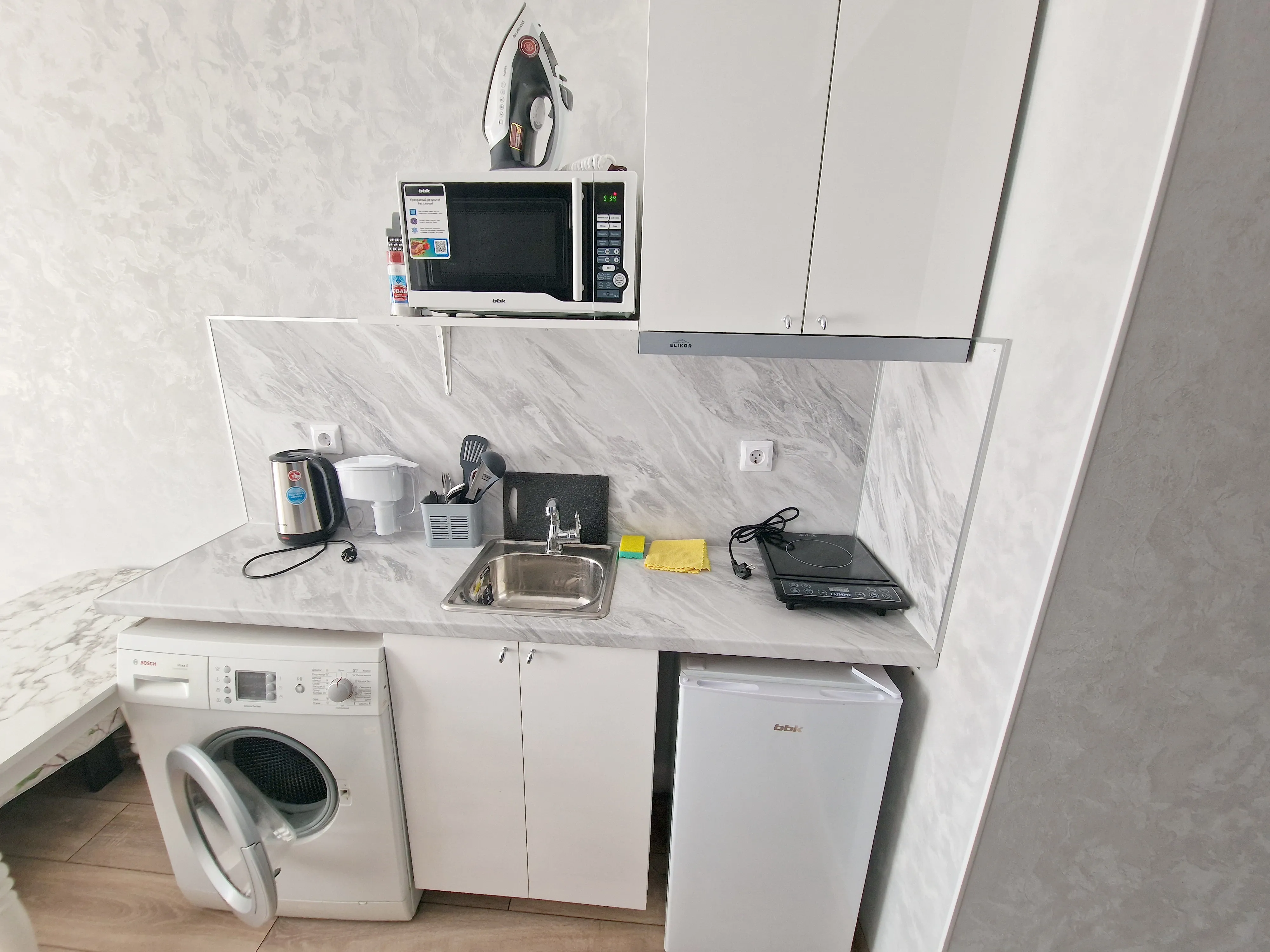 Студия меблирована и обеспечена техникой, тв, кондиционер и т. д.