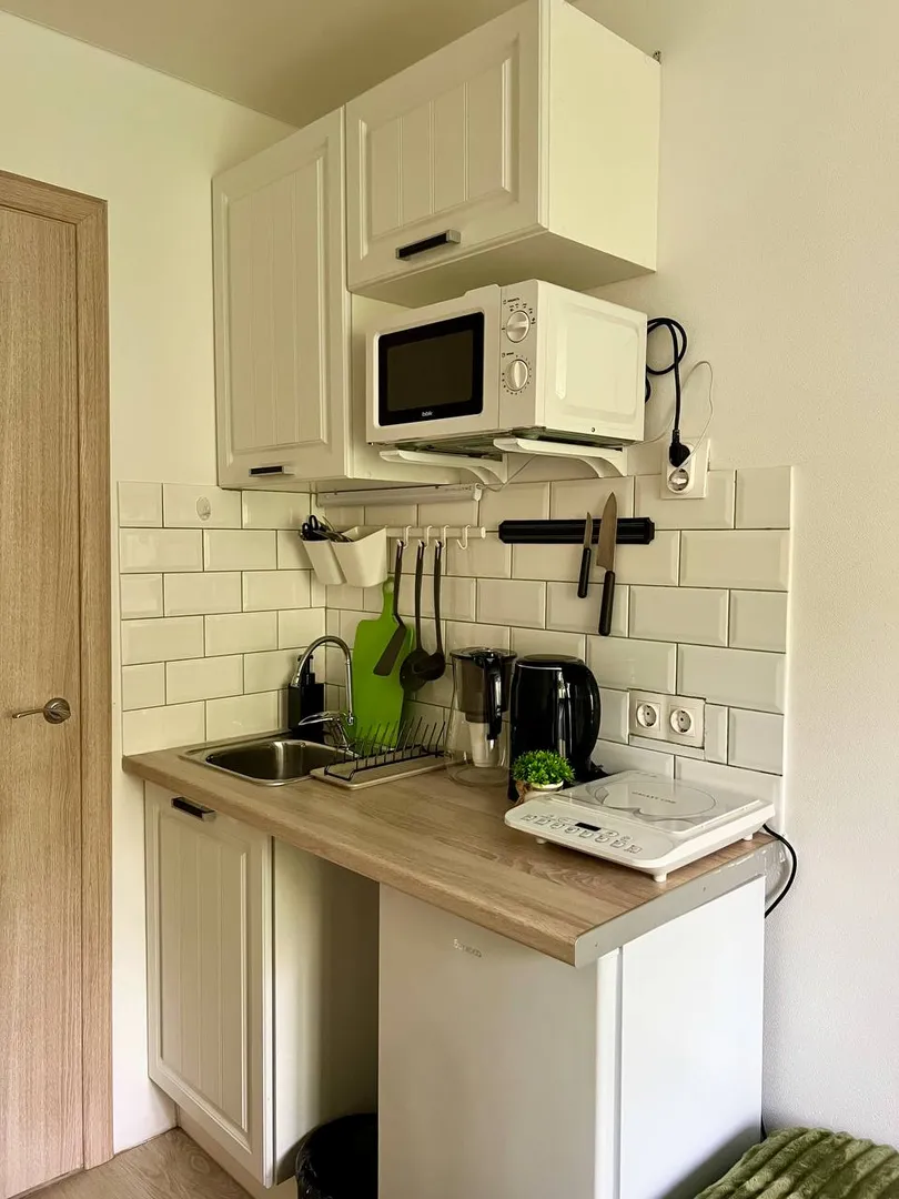 - Кухонная зона оборудована всей необходимой техникой и посудой (микроволновая печь, мини-холодильник, фильтр для воды, электрочайник и электроплита).