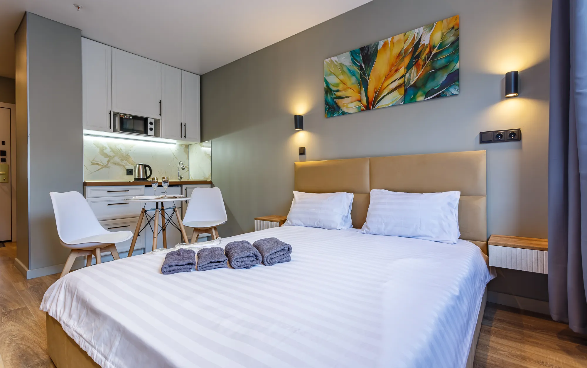 Удобства в апартаментах: wi-fi (100мб сек), смарт тв 45 дюймов!!! -СВЧ - чайник - вся необходимая посуда - качественные постельное бельё и полотенца - тапочки, зубной набор, гель, шампунь - утюг - гладильная доска - фен и прочие бытовые мелочи.
