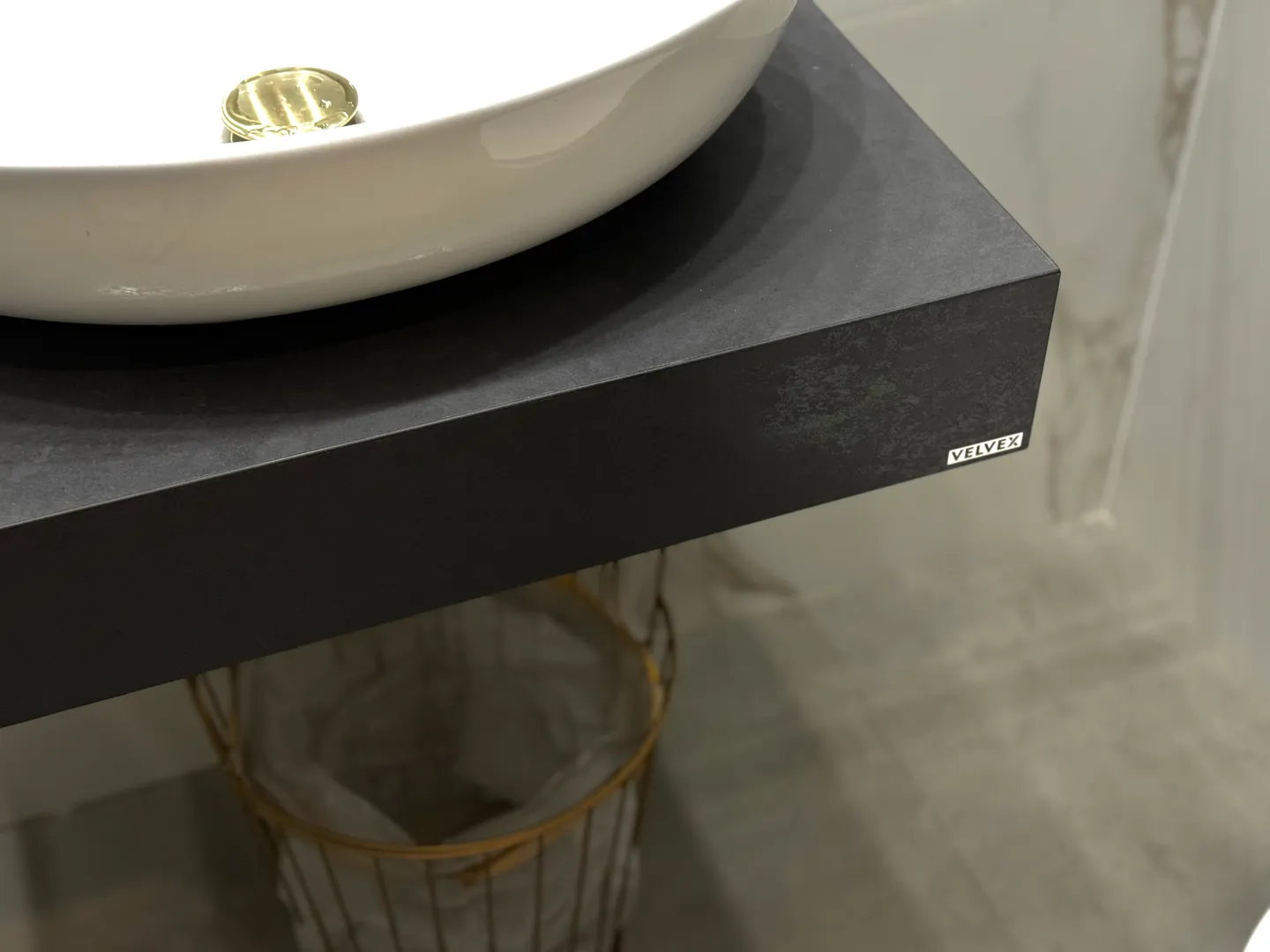 Ванная комната оснащена душевой, сантехникой, выполненной в цвете золото, что лаконично сочетается с рисунком мрамор и лепниной на стене, которая также украшает стены в студии.