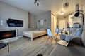 Прихожая с зеркалом, вместительный шкаф для одежды, полноценная кухня, обеденная зона, уютная гостиная зона с диваном и камином, большая двуспальная кровать.