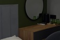 Номер оборудован двухспальной кроватью, широкоформатным телевизором со Smart TV, мини-холодильником и кондиционером, компактным рабочим столом, а также шкафом и тумбой для одежды.