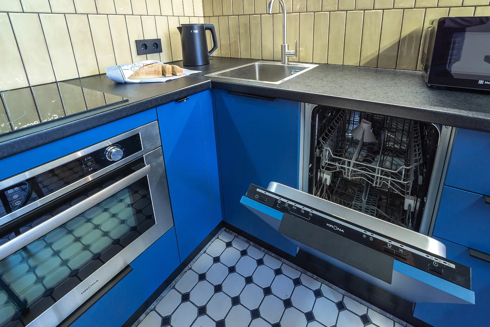 На кухне вы сможете приготовить любимые блюда, для этого есть все необходимое. Чай, кофе, соль, сахар заботливо приготовлены для вас.