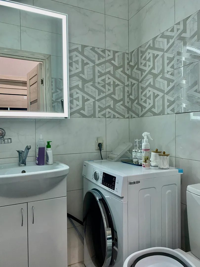 Ванная комната оборудована ванной и стиральной машиной. Есть фен, шампунь и гель для душа, полотенца, гладильная доска, сушка для белья.