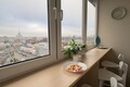 В спальне большая кровать с мягким изголовьем шириной 1,8 м., с удобным матрасом и превосходным сатиновым белоснежным постельным бельём премиум класса. Изюминка спальни — чил-зона, подиум с матрасом и подушками. Кстати, рядом розетка и точечный светильник. Можно позалипать, листая ленту соцсетей, или посмотреть сериал, наблюдая, как меняется город.