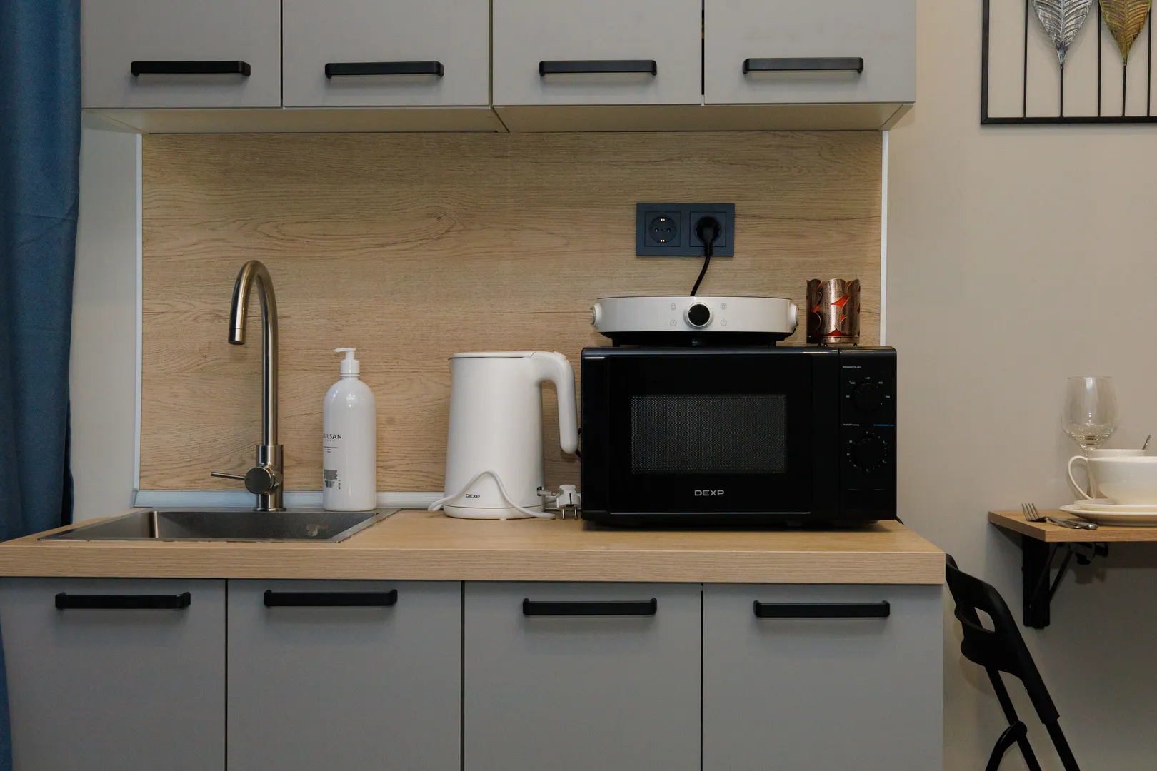 - Кухня с холодильником, плитой, микроволновкой, чайником и посудой