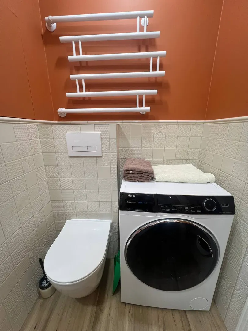 В ванной стиральная машина с режимом стирки и сушки белья, фен, полотенца, одноразовые тапочки, гель для душа, шампунь, туалетная бумага.
