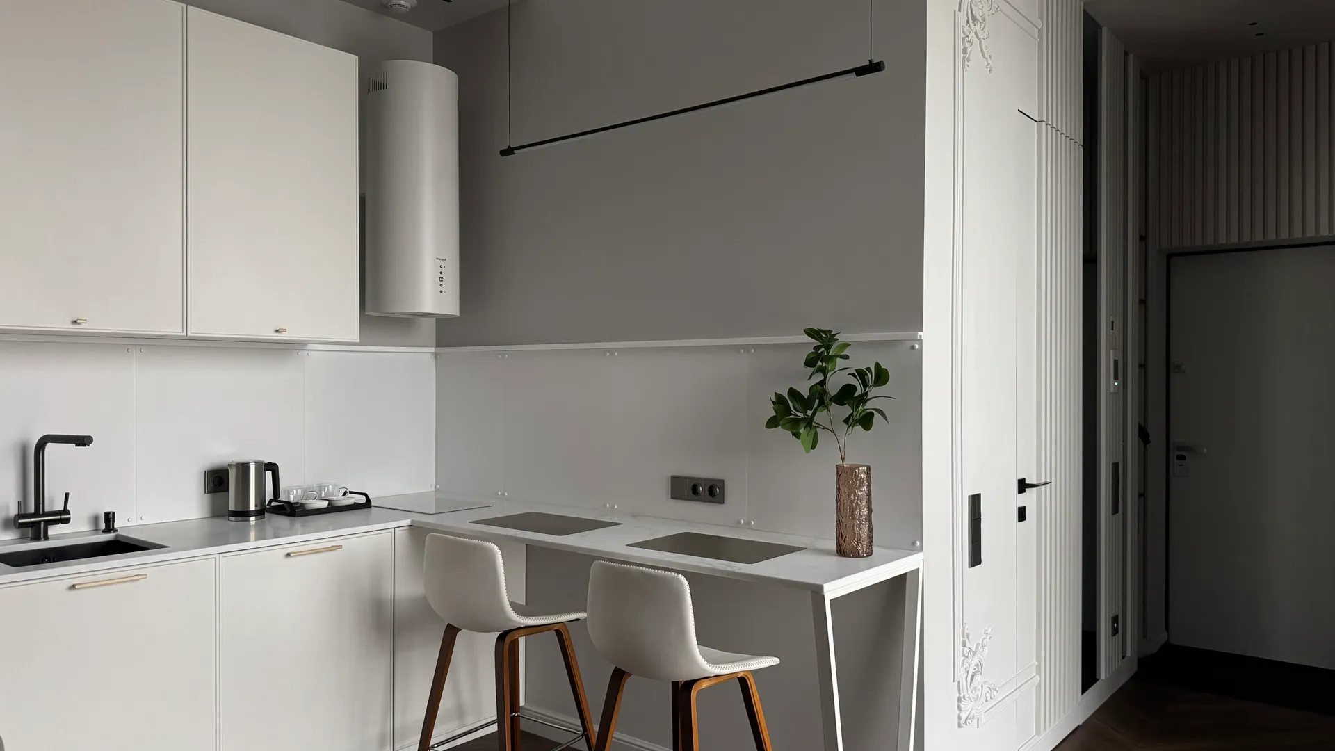 - холодильник, СВЧ, варочная панель, вытяжка, посудомоечная машина, чайник