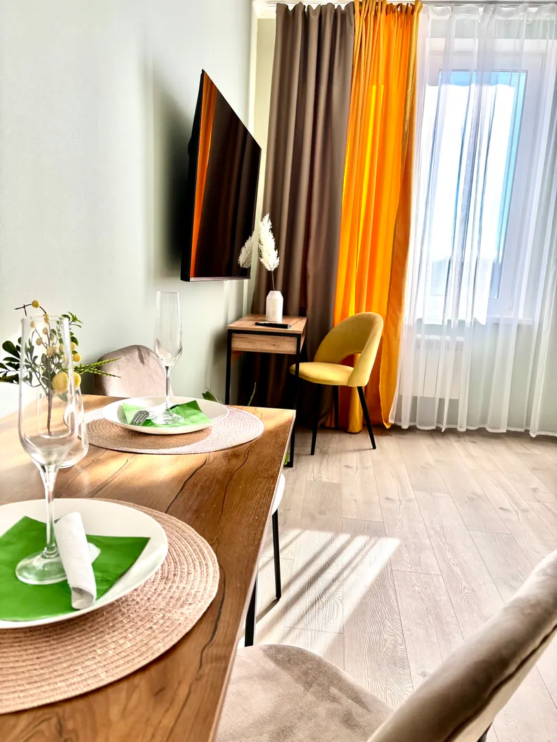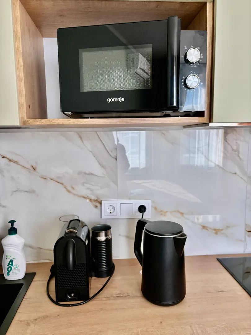 В уютной кухонной зоне вы с удовольствием позавтракаете в тишине. Кухня полностью оборудована всей необходимой посудой и техникой (включая кофе машину, плиту, микроволновую печь), сможете приготовить себе домашний ужин.